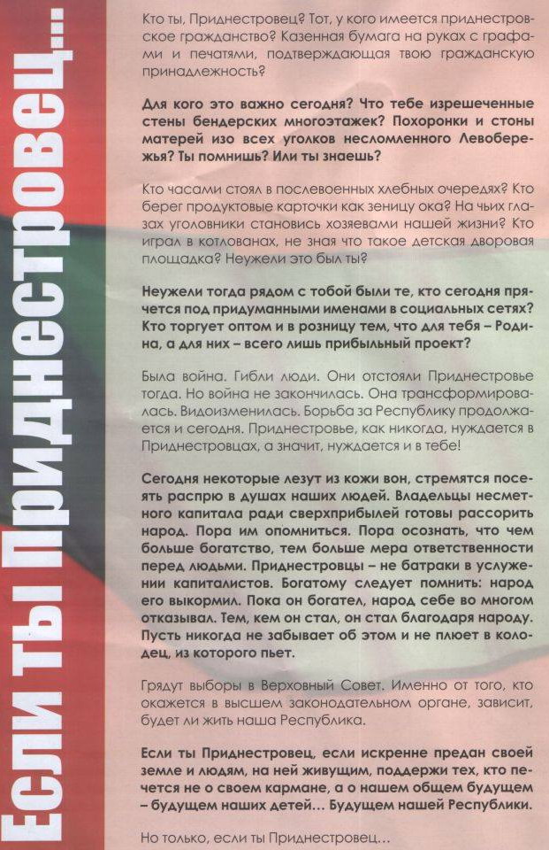 С фэйсбука, Светлана Б: Новое художество у нас на Кировском от неизвестного автора.... Прочла и как-то мерзко стало… я родилась в 1984 году в г.Дубоссары, когда началась в Приднестровье война я была маленькой девочкой, но очень хорошо помню все что происходило… Мы жили в микрорайоне Коржево, которому сильно досталось во время войны… Вся крыша нашего дома была как решето. В окнах не было стекол, а на подоконниках стояли мешки с цементом и стопки книг, чтобы пули или осколки не попали в дом. Мы никуда не уезжали во время войны. Помню как шли из школы и начался обстрел, нас совершенно незнакомые люди завели к себе во двор, налили клубничный компот, и никто не задавался вопросом кто мы и откуда…… Помню соседа Димку, которому навсегда останется 11 лет. А сейчас кто-то решил разделить нас на приднестровцев и не приднестровцев Цинично играть на события, которые во многих семьях отзываются болью и делить единый сильный народ. Комменты: - Заберите кто-нибудь у них печатный станок. Хватит прикрывать свой черный пиар нашим флагом и нашей историей! - А по моему у нормального человека по отношению к этим листовкам нормальная реакция - не хочется в говно попасть, т.е. чувство брезгливости. Гондурасы питерские уедут, а остальные останутся..... Им повод задуматься, как людям в глаза смотреть будут? - Интересно написано. Получается, что этой бумажке призывают большинство населения голосовать "против всех", так как почти на всех округах ряд кандидатов печётся именно о своём кармане, а не о будущем Республики. - в 1992 году ,весной-летом я находился неподалёку ,от тебя в окопах под Кочиерами . Право не знаю какой подонок мог написать подобное . Но знаю точно ,только одно не МИРА он желает нашей ЗЕМЛЕ , а поймав такого нужно попросту придушить его , А порой мне кажется ,что кому-то уж ,очень хочется удержаться у власти и он ради -этого готов пойти на все ,даже на гражданское противостояние . Но все-таки НАШ НАРОД ,такого не допустит - Нельзя призывать к противостоянию. Нам разве примеров у соседей мало!? То Штански обещает чрезвычайное положение ввести, то Шевчук обижается на "ботов" и депутатов ( кстати, своих недавних коллег, которых собирал на борьбу со Смирновым). Вы куда хотите нас завести? Хватит! Одумайтесь ради себя самих! |