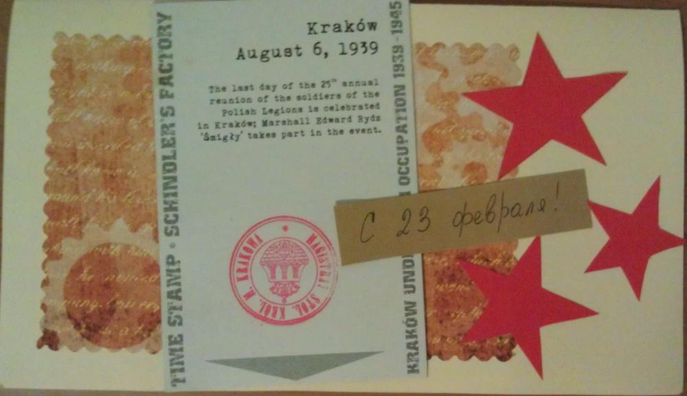 Девушка любит путешествия и кошек, дома есть кошка. Подарила всем открытки индивидуальные, в каждой своя фишка. Для Бори - открытка с пропуском на знаменитую фабрику Шиндлера в Польше. |