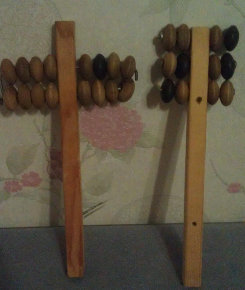 Вот пытаюсь сделать массажер для спины из старых счет. Что то всё не то получается. Наверное надо два-три длинных шурупа с гайками, а на них одевать бублики. Вариант 1 - толстая проволка, второй - тупо забил гвозди. Добавил фото - уже прикрутил на шурупы (винты) колесики, сначала дрелью засверлил дырки. |