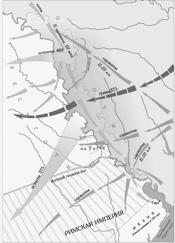 Приднестровье в 1- 4 веках. На рубеже нашей эры в Поднестровье закрепляются кочевники — сарматы. Условия обитания сарматов в регионе не цельным этническим массивом, а вперемешку с другими племенами способствовали тому, что их культура оказала глубокое влияние на культуру соседей, которое особенно проявилось в эпоху великого переселения народов. Так, Страбон сообщал, что в Подунавье сарматы смешивались с кельтами. Тацит отмечал смешанные браки между певкинами и сарматами. Он также отмечал влияние сарматов на венедов. Сарматы оказали существенное влияние на соседние племена карпов. Известны многочисленные факты активного влияния сарматов на германцев Подунавья и Поднестровья. На рубеже и в первых столетиях нашей эры мощное влияние сарматов ощущается не только в пределах варварского мира, но и в высокоразвитых греческих рабовладельческих городах Северо-Западного Причерноморья. Сарматизация городов этого региона была вызвана не только культурным контактом их населения с сарматами, но и проникновением сарматов в эти города. Так, из надписей II в н. э. известно, что сарматы входили в состав населения Тиры и других городов. Таким образом, сарматы активно влияли на культуру и этнический состав населения греческих городов СевероЗападного Понта, да и римского мира вообще: у сармато-алан перенималась одежда, украшения, приемы конного боя. Все это позволяет считать западных сарматов существенной слагаемой частью населения низовьев Днестра и Дуная в I —III вв. Сарматы оказали большое воздействие на формирование варварского населения региона в это время. Заселив Поднестровье и Нижнее Подунавье, сарматские племена аланы и роксоланы стали одной из ударных сил, сокрушивших Римскую империю. Позднеантичная культура, в свою очередь, оказывала влияние на быт и духовную культуру сарматов, особенно аристократии. Под ее влиянием и влиянием соседних племен сарматы начинают переходить к оседлости и земледелию. В первые века нашей эры в среде племен Днестровских земель получает распространение провинциальный римский бытовой инвентарь, что указывает на благоприятную обстановку, которая сложилась в области хозяйственных контактов между более высоким римским миром и менее развитым племенным. Воздействие античного мира на ближнюю племенную периферию региона, ограниченное в основном рамками материальной культуры, осуществлялось через торговые контакты, способствовавшие социальной и имущественной дифференциации в среде варварских обществ. В III в. усложнился этнокультурный состав Днестровских земель в связи с появлением германских племен, переселившихся сюда из областей, расположенных вдоль р. Висла. С этими событиями согласуются сведения письменных источников о мощном союзе племен во главе с готами. В низовья Днестра и Дуная готы продвинулись, переправившись сначала через Днестр в верхнем его течении, а затем через Прут, и вышли в долину ета. Днестр стал границей между остготским (грейтунги) и вестготским ( тервинги) племенными союзами. Тервинги занимали Нижнее Поднестровье и Подунавье. Новые этнические племена положили конец сарматскому владычеству и захватили в конце П—IV вв. ведущую роль в варварском обществе Северо-Западного Причерноморья. Под давлением готов усилился натиск карпов на римскую провинцию Нижняя Мёзия.С приходом