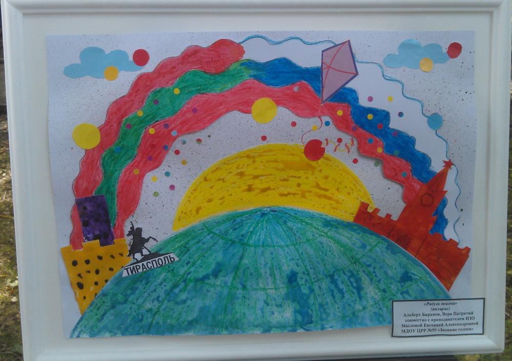 Подборка картин юных тираспольских художников на тему объединения РФ и Приднестровья. "За единство с Россией", Штро Кирилл - 4 года, Михальченко Аня - 4 года, Бажинова Милана - 4 года. Садик №28. Техника торцевания.