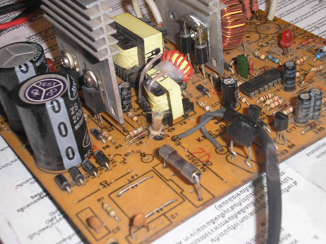 Ремонтировал ноут ТОШНИБА. Дефект , умерший адаптер. С виду ничего сложного. Ну где утром, в воскресенье найдешь адаптер для ТОШНИБЫ. Нашел старый АТешный блок, доработал до нужных напряжений и мощностей. Подключил. Дабы ничего не замкнуть, не уронить, сей ХЕНД-МЭЙД, положил в коробку. ОТремонтировал плату, собрал ноут. Включил. Ноут поругался на батарею, дату время, неверный чек сум и запустился. ТЕстить особенно времени не было, запустил фильм. Через мин 20, из коробки вспышка молнии и хлопок. Отстрелил взорвавшийся конденсатор.
