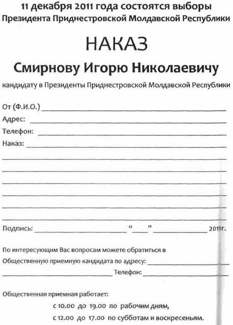 Вот принесли листовки: ДОРОГИЕ ПРИДНЕСТРОВЦЫ! ЗЕМЛЯКИ! ТОВАРИЩИ! Сегодня наша республика стоит перед выбором. И дело не в трёх или пяти кандидатах в президенты. Это выбор между независимостью и вхождением в Молдову, между свободой и румынским гнётом, между рабством и человеческим достоинством. Нет никакой разницы, кто станет посредником в продаже Приднестровья - западные спецслужбы или группировка псевдороссийских политических аферистов. Мы не успеем оглянуться, как войдем в состав Молдовы и Румынии под лозунгом «Вместе с Россией», а под лозунгом «Будет порядок» примем на постой натовских солдат! На деле все это означает «Деньги предателям -ярмо народу!». Народ Приднестровья это не устраивает. Республику нужно спасать. Наша Родина не сдалась в 1992 году. В 2006 мы сделали свой выбор. 20 лет мы боремся за признание. Сегодня, в 2011 году, мы выбираем президента, и голосуем ЗА СМИРНОВА! Республпка НЕ ПРОДАЁТСЯ! МЫ ЗА СМИРНОВА ПОТОМУ, ЧТО: СМИРНОВ - ПОЛИТИК МИРОВОГО УРОВНЯ Смирнов один из немногих политиков, кому в XX веке удалось создать и отстоять новое государство. Смирнов вместе со всем приднестровским народом создал, сохранил и совершенствует все государственные институты: институт президенства, парламент, министерства и ведомства, местные органы власти, финансовые и правоохранительные структуры, почту, телевидение и радио, систему просвещения и здравоохранения. Смирнов не провинциальный политик. Он - государственный деятель мирового уровня. СМИРНОВ - ЗАЩИТНИК ПРИДНЕСТРОВЬЯ Смирнов в 1992 году не бросил молодую республику, как это сделали многие, кто сегодня примеряет на себя славное имя Защитника ПМР. Смирнов как истинный народный лидер проявил личное мужество и возглавил оборону Приднестровья от агрессии молдо-румынских националистов. Смирнов - руководитель, под началом которого мы дали достойный отпор агрессору и защитили свою Родину. СМИРНОВ - НАРОДНЫЙ ДИПЛОМАТ Смирнов установил добрососедские, выгодные Приднестровью отношения с признанными мировыми державами, в первую очередь, с Россией. Смирнов добился хотя ещё не юридического, но уже фактического признания Приднестровской Молдавской Республики (договор Жуков-Смирнов). Смирнов инициировал референдум 2006 года, на котором мы высказались за независимость и последующее свободное присоединение к России. Для Смирнова этот курс неизменен. СМИРНОВ - ЗАБОТЛИВЫЙ ХОЗЯИН Смирнов обеспечил полную газификацию республики и дал старт новой президентской программе по обеспечению приднестровцев чистой питьевой водой. Смирнов проводит сильную социальную политику. В Республике, где на 500 000 населения приходится 140 000 пенсионеров, регулярно выплачиваются и повышаются пенсии, пособия и доплаты, исполняются льготы для 29 категорий льготников. Смирнов принимает меры, способствующие тому, что в многонациональной республике отсутствуют этнические конфликты, гармонично развиваются русская, молдавская, украинская и другие национальные культуры. СМИРНОВ - ГАРАНТ СТАБИЛЬНОСТИ Смирнов - единственный политик, который в условиях внешнеполитического обострения (попытки «сдать» Приднестровье Молдове, продвижения НАТО на Восток, агрессии Молдовы и т.п.) будет до конца защищать Республику. Смирнов, в отличие от его слабых несамостоятельных и подконтрольных полиических конкурентов, удержит ситуац