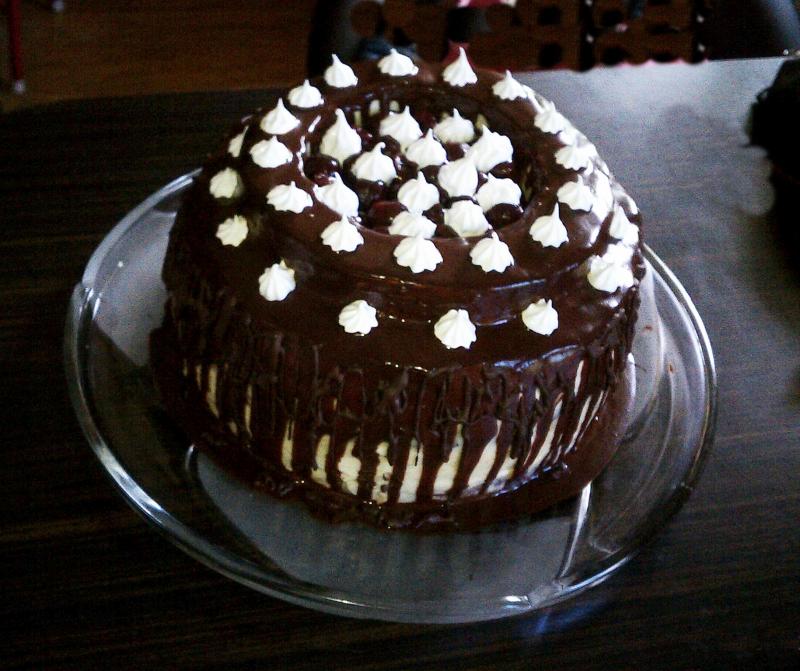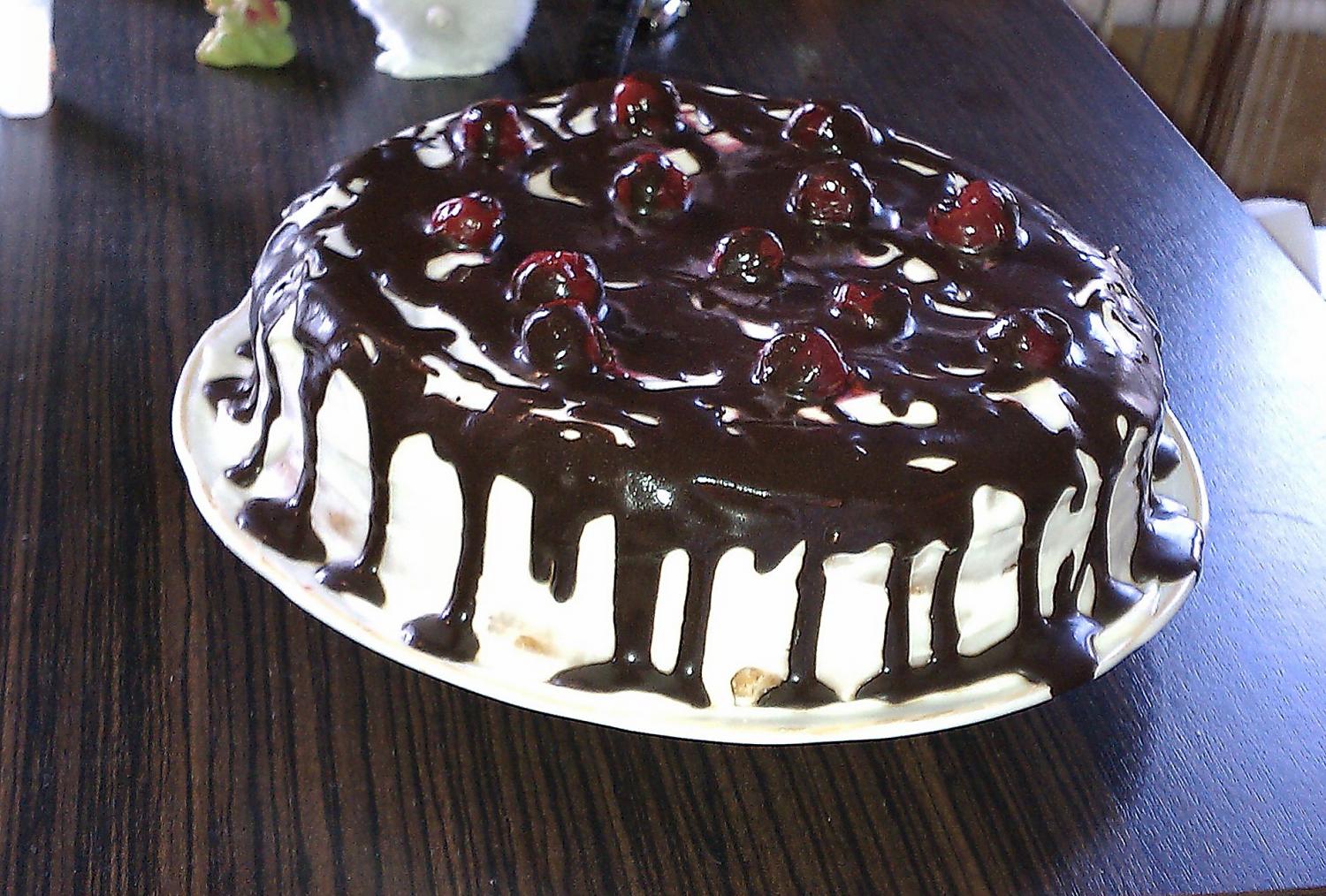 этот бисквит с вишнями(внутри тоже) с шоколадной глазурью из порошка какао........в разрезе нет, так как в подарок готовился как и следующий тортик....