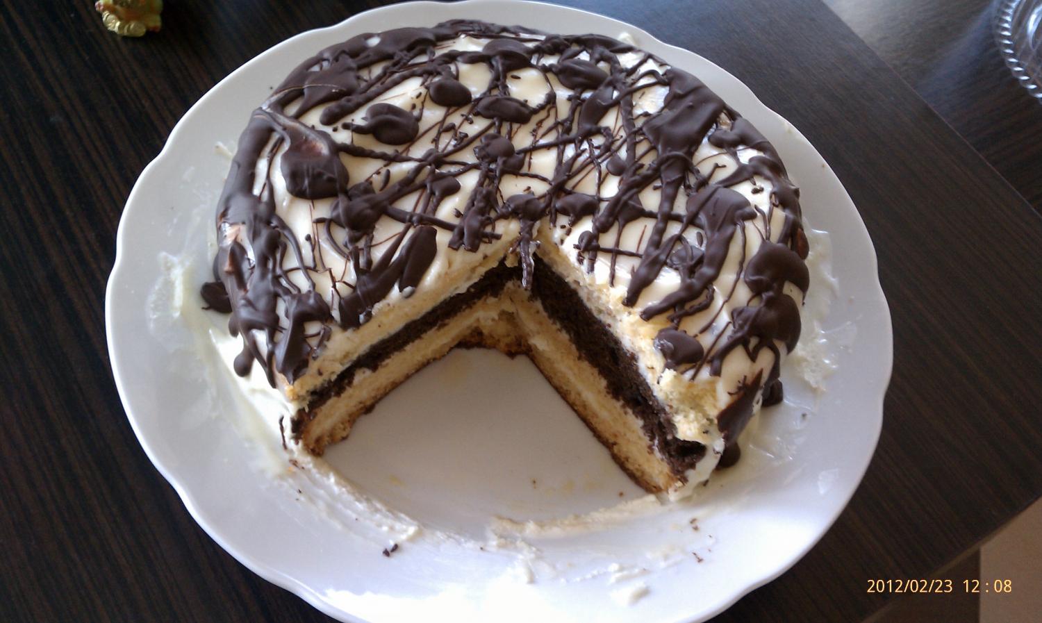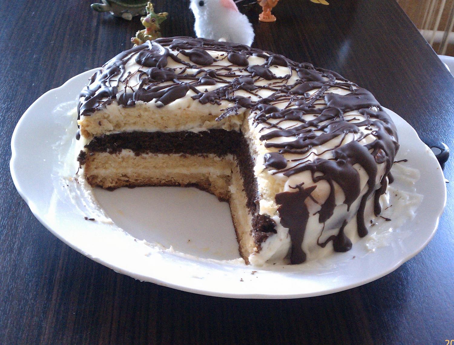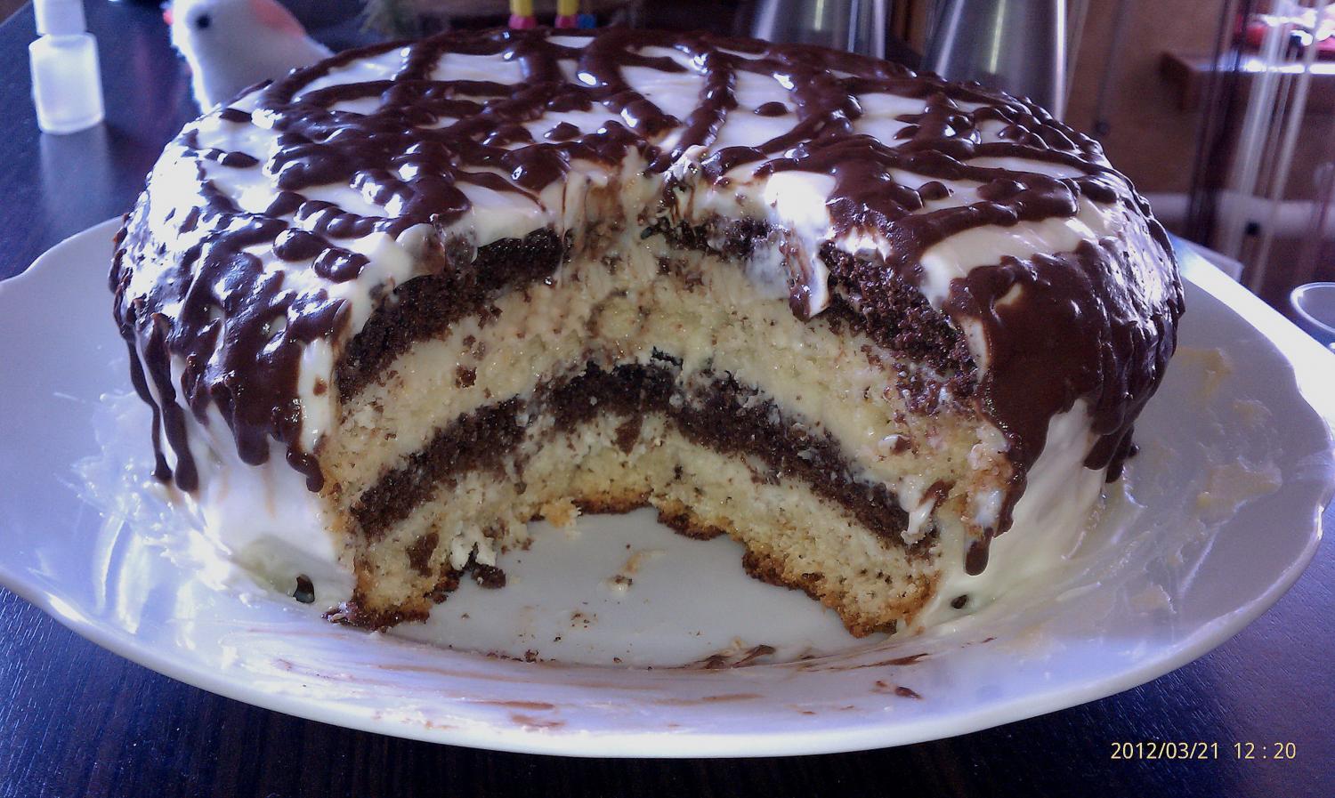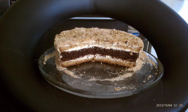 самый последний ...прям таял во рту мягенький такой...)))бисквит с заварным кремом.глазурь- шоколад растопленный со сметанкой и сахаром.....орешки запечены в коржики .