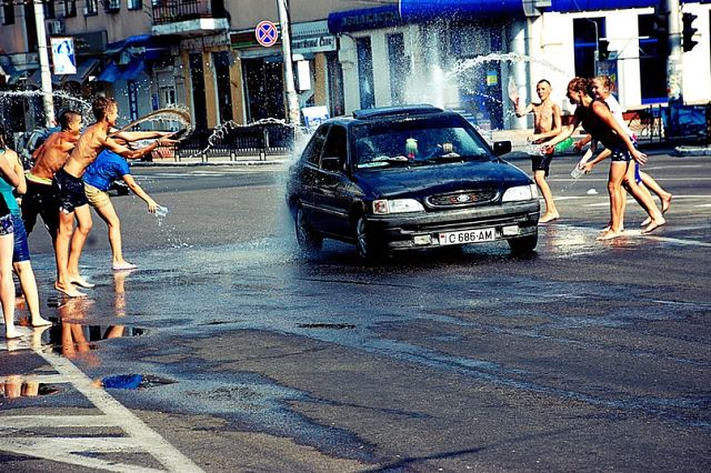 А мне нравится! Жара, народ развлекается, как может. Вряд ли кто-нибудь может обидеться, если его окатят холодной водой при +39 градусах. Разве что, выряженный в строгий костюм с галстуком и белой рубашкой сноб, спешащий на важную деловую встречу.