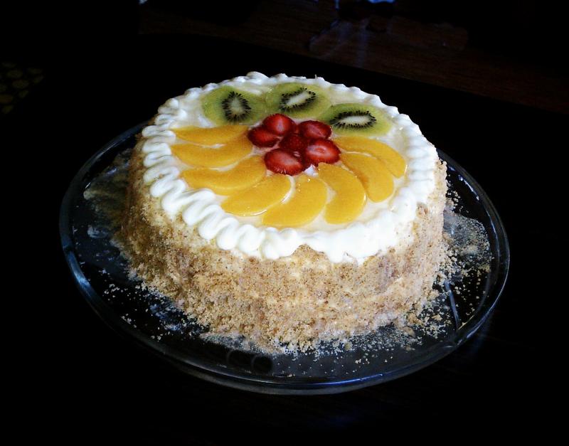 фруктовый тортик, настоящий белый бисквит, пропитанный ромом с бананами внутри ...верх- фрукты в желе.