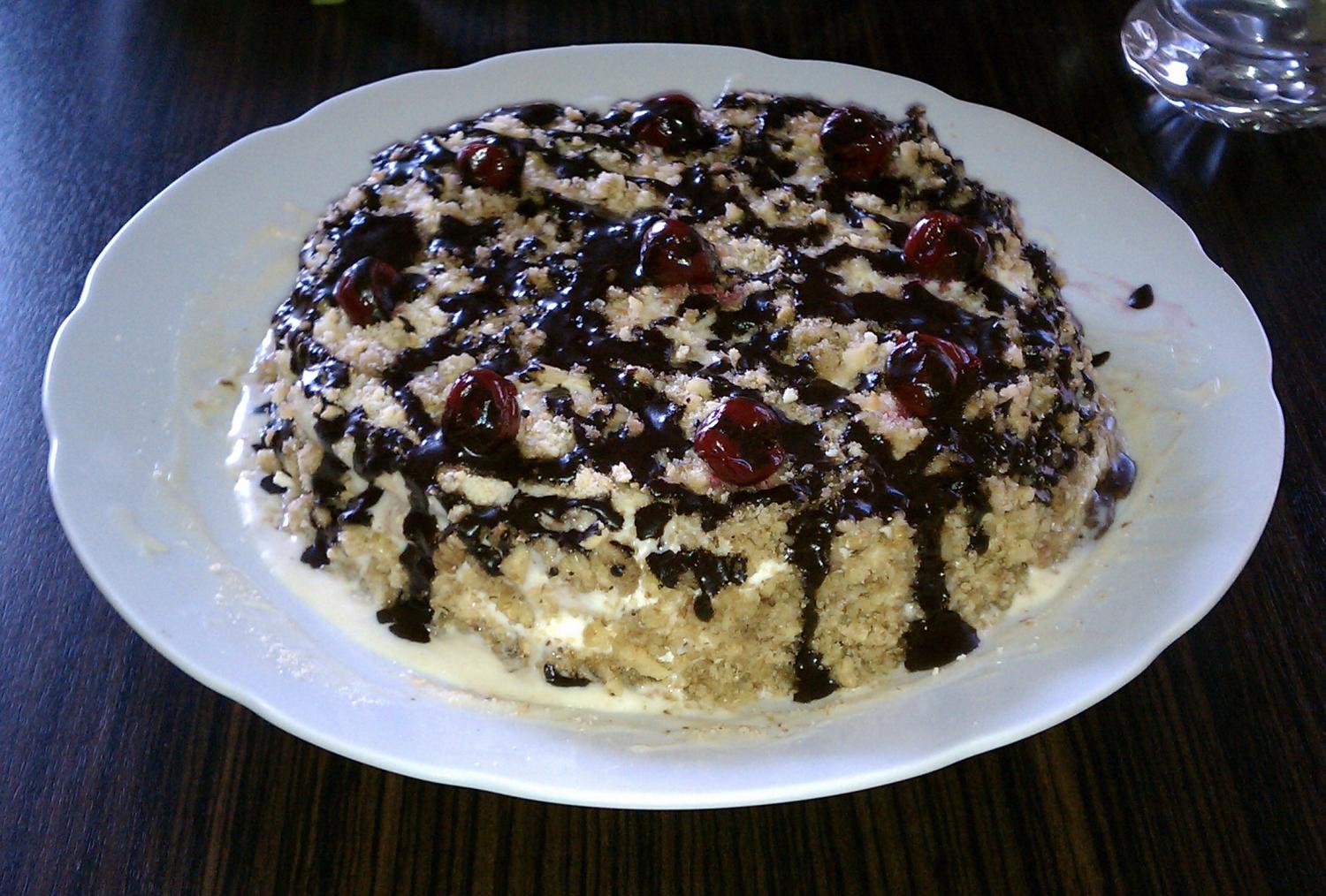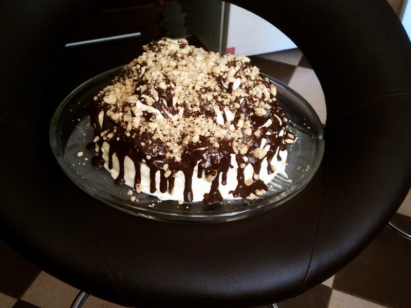 самый последний ...прям таял во рту мягенький такой...)))бисквит с заварным кремом.глазурь- шоколад растопленный со сметанкой и сахаром.....орешки запечены в коржики .