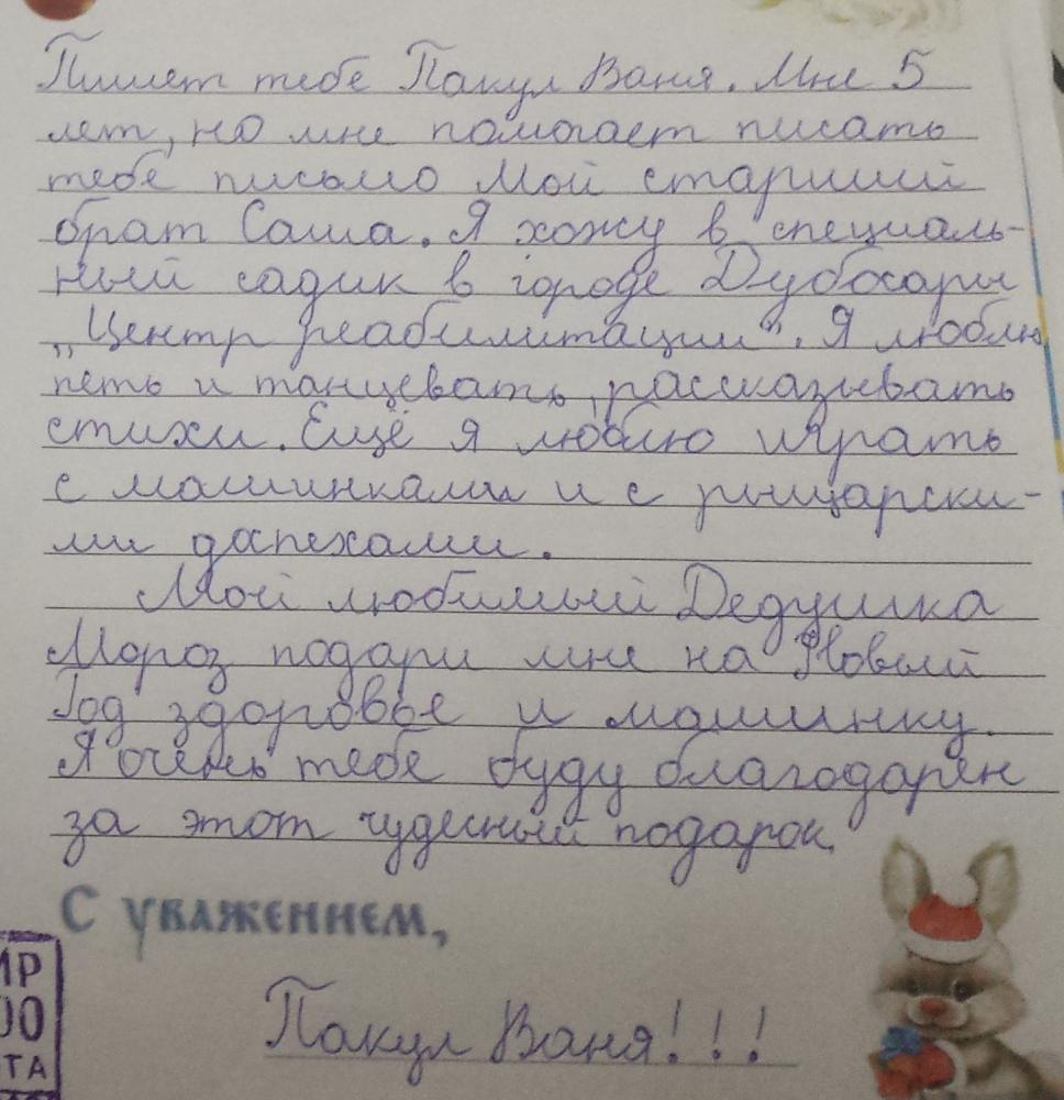 Пишет тебе Пакул Ваня. Мне 5 лет, но мне помогает писать письмо мой старший брат Саша.