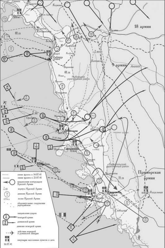 ВЕЛИКАЯ ОТЕЧЕСТВЕННАЯ ВОЙНА1941—1945 гг. ОБОРОНА ПРИДНЕСТРОВЬЯ (июль - август 1941 г.) В 4 часа 30 минут 22 июня 1941 г. румынские бомбардировщики нанесли удар по аэродрому в Тирасполе, около 5 часов утра эта же группа бомбардировщиков атаковала аэродром в Кишиневе. Почти одновременно немецкие самолеты нанесли удар по мостам в Рыбнице. Эти первые удары не причинили сильного урона военным объектам и частям Красной Армии. Немецкая армия натолкнулась на организованный отпор и стала нести серьёзные потери: в ряде пунктов войска не смогли пересечь границу, а на левом фланге, где наступали румынские войска. Части Одесского Особого военного округа, как и Севастопольская военно-морская база, оказались наиболее подготовленными к началу боевых действий. Необходимо отметить, что немецкое командование отводило южному флангу советско-германского фронта второстепенную роль. Две крупные водные преграды - Прут и Днестр, а также союзники румыны, мало пригодные для выполнения военных операций, не оставляли для командования вермахта стратегического и тактического простора. 30 марта 1941 г. начальник Генерального штаба Сухопутных сил Германии Ф.Гальдер записал в своем дневнике: "... Никаких иллюзий по отношению к союзникам! Финны будут храбро сражаться, но их мало... ... От румын вообще ничего нельзя ожидать. Возможно, они будут в состоянии лишь обороняться под прикрытием сильной преграды (реки), да и то только там, где противник не будет атаковать..." Поэтому основной удар на юге наносился силами 17-ой и 11-ой немецких армий на стыке Юго-Западного и Южного фронтов (Южный фронт образован Директивой Народного комиссара обороны № 04 от 24.6.41 г. июня, штаб фронта сформирован на базе Московского военного округа, командовал фронтом генерал-полковник И. В. Тюленев). Против 9-ой армии Южного фронта, прикрывавшей государственную границу от Липкан до устья Дуная (около 500 км), действовала группировка группы армий «Юг» в составе 11-ой немецкой армии (14 дивизий) и двух румынских армий (дополнить), пограничного морского отряда, частей морской пехоты, румынский флот, 6-ой немецкий воздушный флот и румынская королевская авиация. 22 июня ЦК КП(б) Молдавии и СНК МССР приняли постановление о задачах партийных и советских органов в связи с нападением фашистских захватчиков на Советский Союз. Как и по всей стране, в Бессарабии и Приднестровье была проведена мобилизация военнообязанных. В течение 22 июня противник активно пытался форсировать Прут во многих местах, но получил отпор. 23 июня началась мобилизация в Красную Армию и формирование истребительных батальонов в Кишиневе, Бендерах, Тирасполе. В дальнейшем до 1 июля активных действий на этом участке Южного фронта не было. Исключением можно считать попытки румын переправиться у Фэлчиу и Скулен. Это было связано с тем, на всем протяжении от Унген и до Черного моря действовали только румынские войска. Однако в 8:00 1 июля под Скуленами при поддержке артиллерии 198-я дивизия немцев форсировала р. Прут. Было введено в бой до ста танков, завязались тяжелые оборонительные бои. 3 июля части Красной Армии на бельцком и кагульском направлениях начали отвод войск. Немцы предприняли ряд попыток прорваться к переправам через Днестр и отрезать 2-ой механизированный и 48-ой стрелковый корпус. Они усилили бомбежки Котовска, Рыбницы и Рашкова. в 10 июля в тылу К