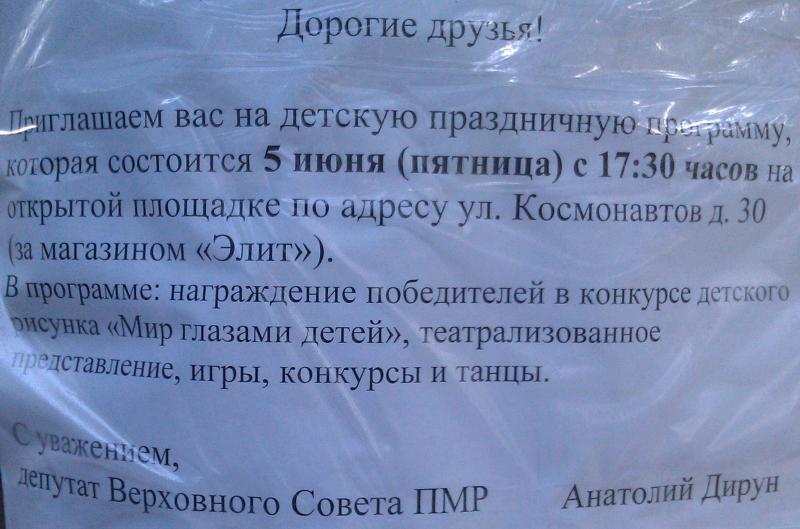 5 июня в 17,30 на детской площадке у магазина Элит - праздничная программа. - награждение деток, победителей конкурса детского рисунка "Мир глазами детей" - театрализованное представление - игры - конкурсы - танцы Депутат ВС ПМР - Анатолий Дирун. |