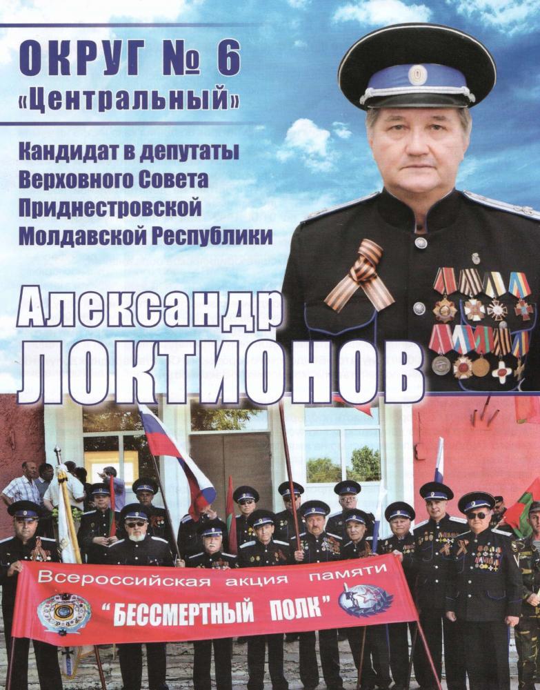 По Бендерам мне более менее понравился кандидат в депутаты Верховного Совета - Локтионов А.И. , хоть и у него, на мой взгляд, некоторые представления о работе государства наивные. Локтионов Александр Иванович, атаман Отдельного Бендорского округа Союза казаков-воинов России и зарубежья. Вот его биография и программа действий в ВС ПМР: + Нажмите здесь, чтобы увидеть полный текст