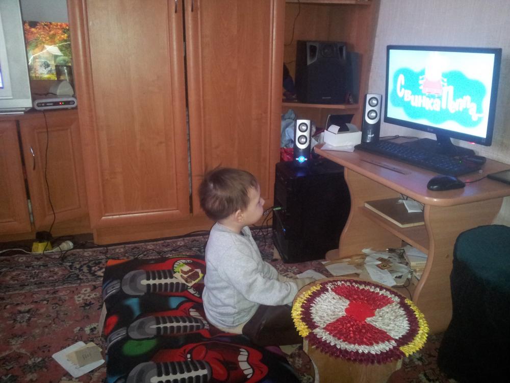 Саша смотрит свинку пеппу. Дети просто нереально зацепились за компьютер, к сожалению.