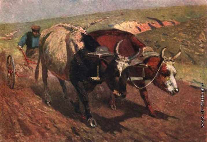 У художников почерк как у врачей (как будто издеваются). По сюжету картина чем-то напоминает Грекова "Волы". Вообще не удивлюсь, если автор этой картины / репродукции - с Восточной Украины, с Дона.