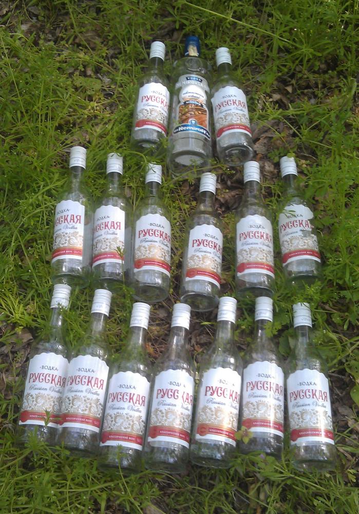 Были на маевке, в кустах где мы сидели, было несколько бутылок от водки, отнесли в мусорку к мосту.