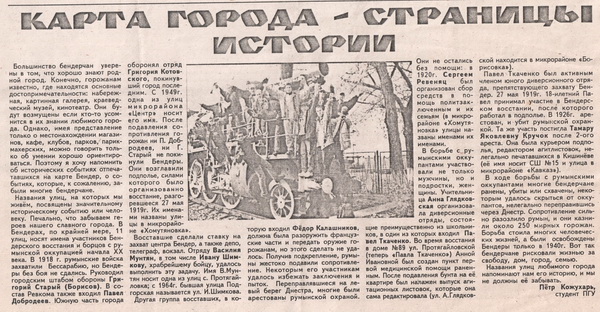 Большинство бендерчан уверены в том, что хорошо знают род¬ной город. Конечно, горожанам известно, где находятся основные достопримечательности: набережная, картинная галерея, краеведческий музей, кинотеатр. Они будут возмущены если кто-то усомнится в их знании любимого города. Однако, имея представление только о местонахождении магазинов, кафе, клубов, парков/парикмахерских, можно говорить только об умении хорошо ориентироваться. Поэтому я хочу напомнить об исторических событиях отпечатавшихся на карте Бендер, о событиях, которые, к сожалению, забыли многие бендерчане. Названия улиц, на которых мы живём, посвящены значительному историческому событию или человеку. Печально, что забываем героев нашего славного города. В Бендерах, по крайней мере, 11 улиц, носят имена участников Бендерского восстания и борцов с румынской оккупацией начала XX века. В 1918 г. румынские войска захватили Бессарабию, но Бендеры без боя не сдались. Руководил городским штабом обороны Григорий Старый (Борисов). В состав Ревкома также входил Павел Добродеев. Южную часть города оборонял отряд Григория Котовского, покинувший город последним. С 1949г. одна из улиц микрорайона «Центр» носит его имя. После подавления сопротивления горожан ни П. Добродеев, ни Г. Старый не покинули Бендеры. Они возглавили подполье, силами которого было организованно восстание, разгоревшееся 27 мая 1919г. Их именами названы улицы в микрорайоне «Хомутяновка». Восставшие сделали ставку на захват центра Бендер, а также депо, телеграф, вокзал. Отряду Василия Мунтян, в том числе Ивану Шимкову, храбрейшему бойцу, удалось выполнить эту задачу. Имя В.Мунтян носит одна из улиц с. Протягайловка; с 1964г. бывшая улица Подгорская называется ул. И.Шимкова. Другая группа восставших, в которую входил Фёдор Калашников, должна была разоружить французские части и передать оружие горожанам, но этого сделать не удалось. Получив подкрепление, румыны жестоко подавили сопротивление. Некоторым его участникам удалось избежать заключения и пыток. Переправлявшиеся на левый берег Днестра, многие были арестованы румынской охраной. Они не остались без помощи: в 1920г. Сергеем Ревеняц был организован сбор средств в помощь политзаключенным и их семьям (в микрорайоне «Хомутяновка» улицы названы именами их именами. В борьбе с румынскими оккупантами участовали ее только мужчины, но и поджростки, женщины. Учительница Анна Глядковская органиовала диверсионые отряды, состоявшие преимущественно из школьников, в один из которых входил авел Ткаченко. Во время восстания в доме №89 ул. Протягайловской (теперь "ПавлаТкаченко") Анной иановной был создан пункт первой мединцинской помощи раненым. После подавления бунта наеё квартире был наладен выпуск агитационых листовок, которые она сама редактировала агигационных (ул. А.Глядковской находится в микрорайоне «Борисовка»). Павел Ткаченко был активным геном юного диверсионного отряда, препятствующего захвату Бендер. 27 мая 1919г. 18-илетний Павел принимал участие в Бендерском восстании, после которого работал в подполье. В 1926г. аресгован, и убит румынской охранкой. Та же участь постигла Тамару Яковлевну Кручок после 2-ого ареста. Она была курьером подполья, редактором агитлистовок, нелегально печатавшихся в Кишинёве её имя носит СШ №15 и улица в микрорайоне «Кавказ»). В ходе борьбы с р