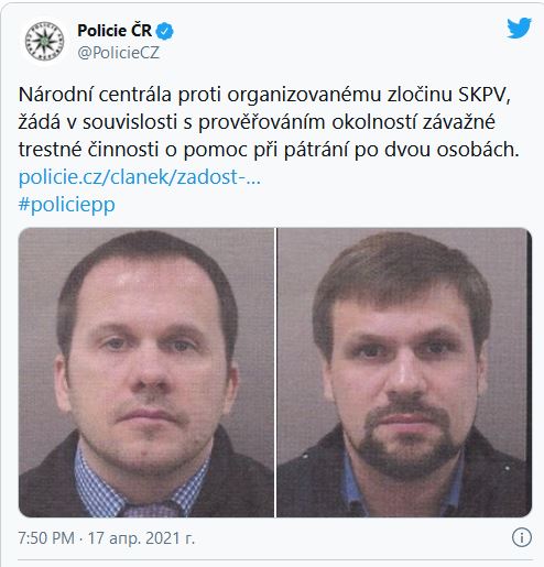 Чехия высылает 18 российских дипломатов из-за подозрений в причастности российских спецслужб к взрыву на складе боеприпасов в 2014 году. Полиция Чехии сообщила, что разыскивает россиян Александра Петрова и Руслана Боширова в связи с расследованием "обстоятельств, связанных с тяжкими уголовными преступлениями". Россия ответила высылкой из страны 20 чешских дипломатов. За что высылают дипломатов О высылке 18 российских дипломатов на экстренной пресс-конференции в субботу объявили премьер-министр Андрей Бабиш и министр иностранных дел Ян Гамачек, который совмещает пост главы МИД Чехии с должностью министра внутренних дел. Гамачек принял решение выслать тех дипломатов, которые подозреваются в работе на две российские спецслужбы - ГРУ и СВР. Они были "четко идентифицированы нашими секретными службами", сказал министр. По словам премьера Бабиша, есть обоснованные подозрения, что агенты этих спецслужб причастны к взрыву склада боеприпасов в деревне Врбетице в районе города Злин, который произошел в 2014 году и унес жизни двух человек, сообщает "Радио Прага". Дипломаты обязаны покинуть Чехию в течение 48 часов. Гамачек признал, что их высылка серьезно подорвет отношения Праги с Москвой. "Но мы должны отреагировать", - заявил он. "Мы находимся в такой же ситуации, как Великобритания при попытке отравления [Скрипалей] в Солсбери в 2018 году", - сказал министр (цитата по ТАСС). 4 марта 2018 года в городе Солсбери в Великобритании было совершено нападение на бывшего офицера ГРУ Сергея Скрипаля и его дочь с использованием нервно-паралитического вещества "Новичок". Британская прокуратура заочно обвинила в нападении россиян Руслана Боширова и Александра Петрова, оговорившись, что считает эти имена вымышленными. Боширов и Петров в розыске Чешская полиция в субботу выступила с отдельным заявлением о том, что в розыск объявлены двое мужчин с российскими паспортами, выданными на имя Руслана Боширова и Александра Петрова. В "Твиттере" полиции опубликовано фото тех же мужчин, которых показывала в 2018 году британская полиция в качестве подозреваемых в отравлении Скрипалей и которые давали интервью Маргарите Симоньян с канала RT, объясняя, что в Солсбери они ездили любоваться достопримечательностями. |