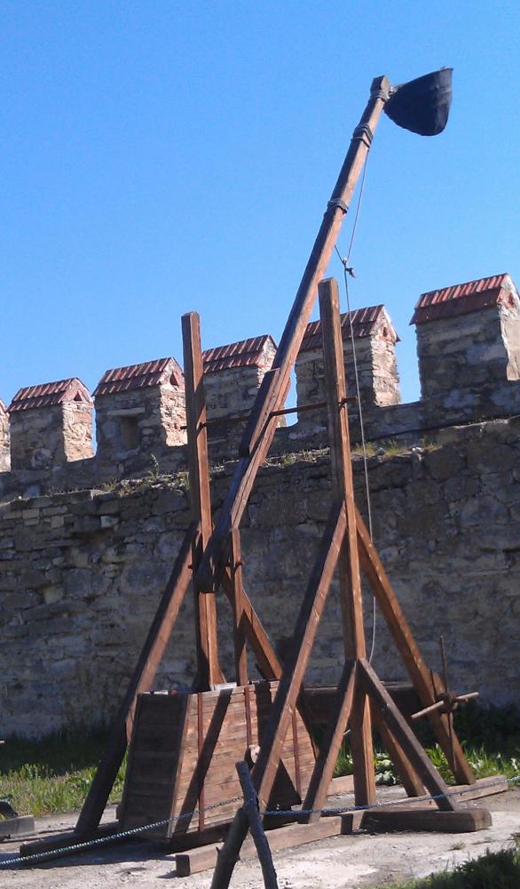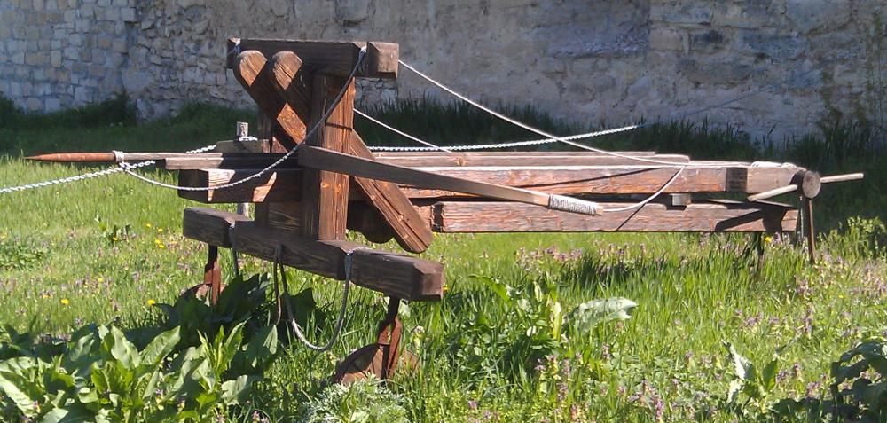 Бендерская крепость - внутренний двор. АРКБАЛЛИСТА (ТОКАБАЛЛИСТА, ОКСИБЕЛ) усовершенствованный вариант гастрофета. Средневековая двухплечевая деформационная, тенсионная метательная машина. Представляет собой большой станковый арбалет на колесом лафете. Аналог полевой артиллерии. Использовали в Средневековье европейскими армиями на поле боя. Могла стрелять большими стрелами, стрелами «карро», каменными и свинцовыми пулями. |