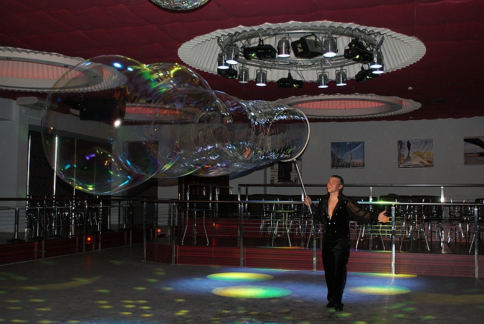 Шоу мыльных пузырей - это яркое экзотическое шоу для взрослых и детей. Мыльные пузыри до 12 метров в длину, пузыри в пузырях, цепочки из пузырей, двойные, тройные, с дымом, и даже... КВАДРАТНЫЕ!!!! Гигантские пузыри поразят своим размером не только детей, но и всех взрослых, присутствующих в зале!!! Каждый желающий сможет сам побывать внутри мыльного пузыря и запечатлеть это событие на фото.