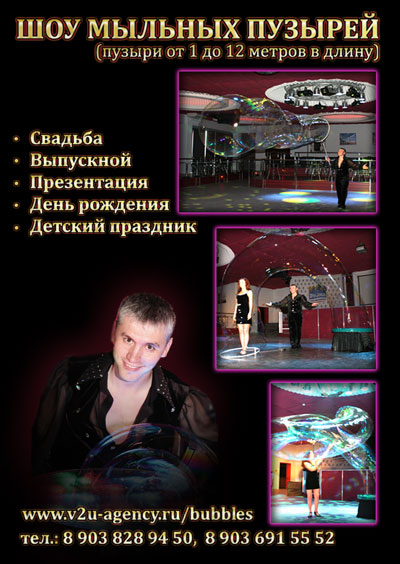 что касается цветов...то вы попробуйте одноцветные надписи читать на разноцветном фоне..да ещё с фотками..?!а разноцветные фоны нужны чтобы подчеркнуть красочность шоу...самих пузырей шлейфов и других элементов.. причём тут космос?))))так "летают" пузыри..на шоу...они же - большие...(от 1 до 3 м в диаметре..в это и правда трудно поверить...пока не увидишь сам))) и очень яркие...а космос - он черный с блестками звёзд))). на визиточном формате все эти переходы...будут не очень заметны)) да, мне тоже нравится та, где жених с невестой целуются в пузыре...это ..на мой взгляд, самый романтичный элемент свадебной программы...!)) макеты постеров у нас уже тоже сделаны.. скоро их тоже представлю..на суд уважаемой публике) Последний раз редактировалось alex; 22.08.2010 в 23:22. |