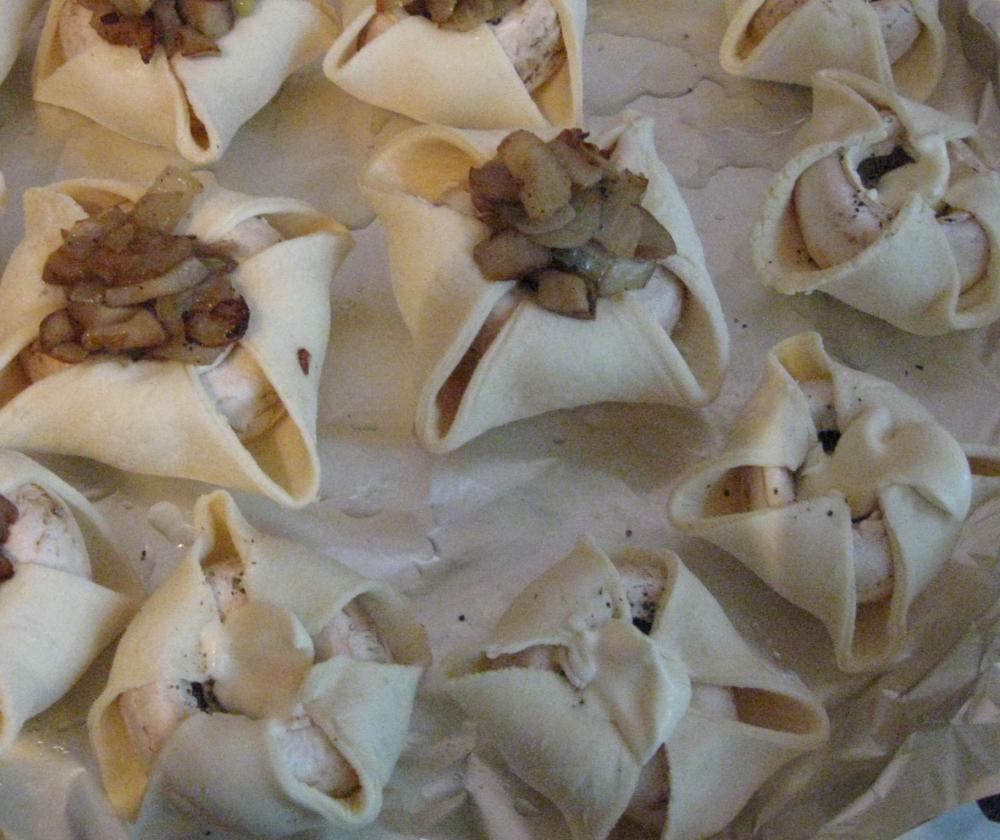 Шампиньоны в слойке Приготовила сегодня новую закуску. Слоеное тесто режем на квадратики. У шампиньонов отделяем шляпки от ножек, чтобы ножки не пропадали я их порезала мелким кубиком и обжарила с луком, так же порезанным кубиком. Далее крупные шляпки нафаршировала обжаренной массой, в мелкие капнула немного майонеза. Каждую шляпку завернула в квадратик теста, посыпала тертым сыром, запекала в духовке при 200 градусах, минут 20, как тесто будет готово, можно вынимать. Закуска разлетелась за 1,5 секунды, получилось очень вкусно и на удивление сытно)) Фото: |