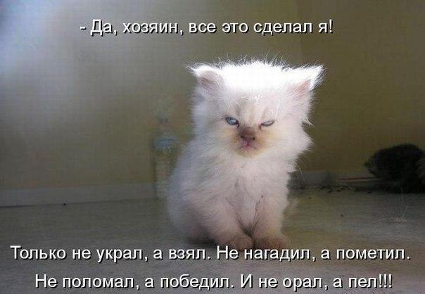 Недавно переехали с «котиком» на новую квартиру... Все, как обычно- обживаемся-знакомимся. И тут приходят соседи : «Мы, говорят, видели у вас на балконе кота. Не кот, а просто красавец, сразу видно благородных кровей. А у нас, говорят, кошечка, тоже сибирская, но, конечно поменьше чем Ваш красавец. И она вся истосковалась по настоящим Котам. Как, говорят у Вас с котом? В смысле, какой он «мужик»? Наша, говорят, киска уже извелась вся , утратила сон, увидев вашего кота-«производителя» на балконе. На улицу, мы видим, он не выходит. Так может мы к Вам заглянем? Не против? Очень хорошо. Только Кот ваш уж очень большой. Такой сильный и грозный, как бы он нашу киску-малышку не порвал? Нет-ее, не порвет? Ну мы тады, ща придем». Ну, поговорил я с ними, и думаю, надо ж Иннокентия обрадовать. Хотя понимаю, он не «глазками» на балконе стрелял и все осознает. Подхожу к коту –«Радуйся, говорю, Иннокентий, свершилось. Ходил ты в холостяках 5 лет, и вроде не просил ничего особенного, не требовал (плюшевый хомяк – не считается –это есть не только у котов).Вот, говорю, сейчас ты узнаешь как много потерял.. сколько не познал…» Звонок, Иннокентий обрадовался, со мной вместе пошел встречать киску своей мечты. Открываю. Соседи с белым комочком на руках. Это было ошибкой… Хотя, прокручивая все назад, ошибкой было то, что я выпустил Иннокентия на балкон… Далее все было как в замедленном кино… Этот белый комок увидев объект своих желаний и бурных фантазий (воспаленного кошачьего мозга-именно так, и никак иначе), решила отгрести бабьего счастья по полной, и МОМЕНТАЛЬНО! Прямо с рук, этот «бурундук» прыгает на моего «грозного» кота и попадает точно на его пушистую, бестолковую голову. А тот … нет, чтобы увернуться… убежать… Он, как завороженный смотрел за полетом этой белки-летяги-альбиноски. Наверное он прокручивал в голове романтические французские фильмы, которые смотрел вместе с нами.., а может он думал - «Дастиш фантастиш» (ну не без этого мы :-)). Не отрицаю, полет был красив и точен (напоминал фильмы канала Дискавери о полете ракеты «воздух-земля»), но…, он был очень не продолжителен… «Ракета», она же «бурундук–альбинос» нашла цель. И МГНОВЕННО начала огребать бабское счастье. Кеша охренел от такого «счастья» и решил спасаться (я его понимаю). Видно не так он представлял всю свою кошачью жизнь «романтические» свидания и их продолжения. Да…, свечей, шампанского, держания за руки(лапы) не было… не было и молчаливых пауз в разговоре… взгляда, в котором ты растворяешься…, да и всего прочего тоже не было.. НИЧЕГО не было –был баллистический удар – и Кеша решил спасаться. Причем, средство спасения уже не играло роли… А дальше... А, дальше всё было как у людей - она летала за котом с криком «я твоя», а он бегал по стенам, полкам, карнизам, шкафам, обоям, и орал благим матом - «Уберите ее от меня, она сумасшедшая… Вы, что, не видите – она маньячка!!». Вот дурак - не понимал своего счастья. Хотя, что с него взять – 5 лет затворничества. Понаблюдав эту феерию акробатических этюдов и некого подобия левитации (кто помнит, были такие цирки с мотоциклами, которые ездят по стенам) , и засомневавшись в законах Ньютона, мы стали ловить животных. Далее скупые факты. Между "начали ловить", и "поймали" находится: • два вазона с цветами; • ваза; • три карниза с занавесками; • четыре поцарапанных руки; • Дверца ш