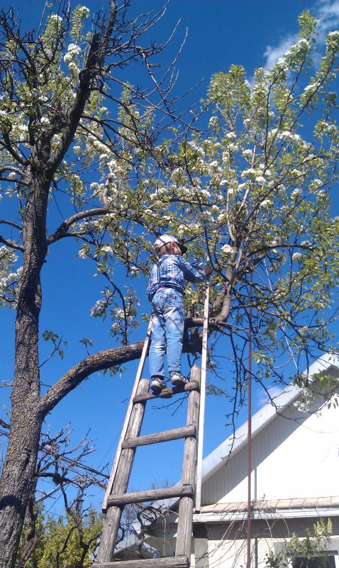 Вот мой папин маленький помощник обламывает сухие ветки с дерева, не за деньги, а потому-что интересно. |