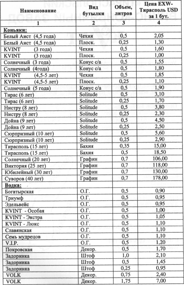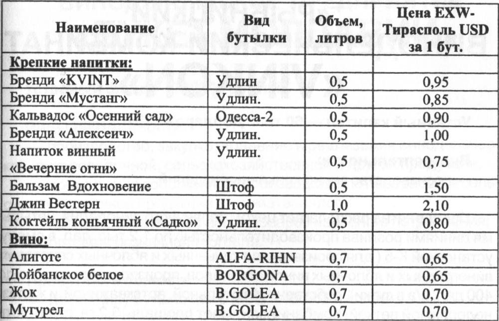 Ассортимент и цены реализуемой продукции: Наименование Вид бутылки Объем, литров Цена в USD за 1 бут. Коньяки: Белый Аист (4,5 года) Чехия 0,5 2,05 Белый Аист (4,5 года) Плоек. 0,25 1,30 KVINT (3 года) Чехия 0,5 1,60 KVINT (3 года) Плоек. 0,25 1,00 Солнечный (3 года) Конус с/а 0,5 1,55 Солнечный (4года) Конус с/а 0,5 1,80 KVINT (4,5-5 лет) Чехия 0,5 1,85 KVINT (4,5-5 лет) Плоек. 0,25 1,10 Солнечный (5 года) Конус с/а 0,5 1,90 Тирас (6 лет) Solitude 0,5 3,10 Тирас (6 лет) Solitude 0,25 1,70 Нистру (8 лет) Solitude 0,5 3,80 Нистру (8 лет) Solitude 0,25 2,30 Дойна (9 лет) Solitude 0,5 4,50 Дойна (9 лет) Solitude 0,25 2,50 Сюрпризный (10 лет) Solitude 0,5 5,60 Сюрпризный (10 лет) Solitude 0,25 2,90 Тирасполь (15 лет) Бахия 0,35 15,00 Тирасполь (15 лет) Бахи я 0,5 18,50 Солнечный (20 лет) Графин 0,7 106,00 Виктория (25 лет) Графин 0,7 118,00 Юбилейный (30 лет) Графин 0,7 130,00 Суворов (40 лет) Графин 0,7 178,00 Водка: Богатырская О.Г. 0,5 0,90 Триумф О.Г. 0,5 0,95 Эдельвейс О.Г. 0,5 0,95 KVINT - Особая О.Г. 0,5 1,00 KVINT - Экстра О.Г. 0,5 1,05 KVINT - Люкс О.Г. 0,5 1,10 Славянская О.Г. 0,5 1,10 Семь мудрецов О.Г. 0,5 1,10 V.I.P. О.Г. 0,5 1,20 Покровская Декор. 0,5 1,70 Задоринка Штоф 1,0 2,10 Задоринка Штоф 0,5 1,45 Задоринка Штоф 0,25 0,95 VOLK Декор. 0,75 2,40 VOLK Декор. 1,75 7,00 Крепкие напитки: Бренди «KVINT» Удлин 0,5 0,95 Бренди «Мустанг» Удлин. 0,5 0,85 Кальвадос «Осенний сад» Одесса-2 0,5 0,90 Бренди «Алексеич» Удлин. 0,5 1,00 Напиток винный «Вечерние огни» Удлин. 0,5 0,75 Бальзам Вдохновение Штоф 0,5 1,50 Джин Вестерн Штоф 1,0 2,10 Коктейль коньячный «Садко» Удлин. 0,5 0,80 Вино: Алиготе ALFA-RIHN 0,7 0,65 Дойбанское белое BORGONA 0,7 0,65 Жок B.GOLEA 0,7 0,70 Мугурел B.GOLEA 0,7 0,70 |