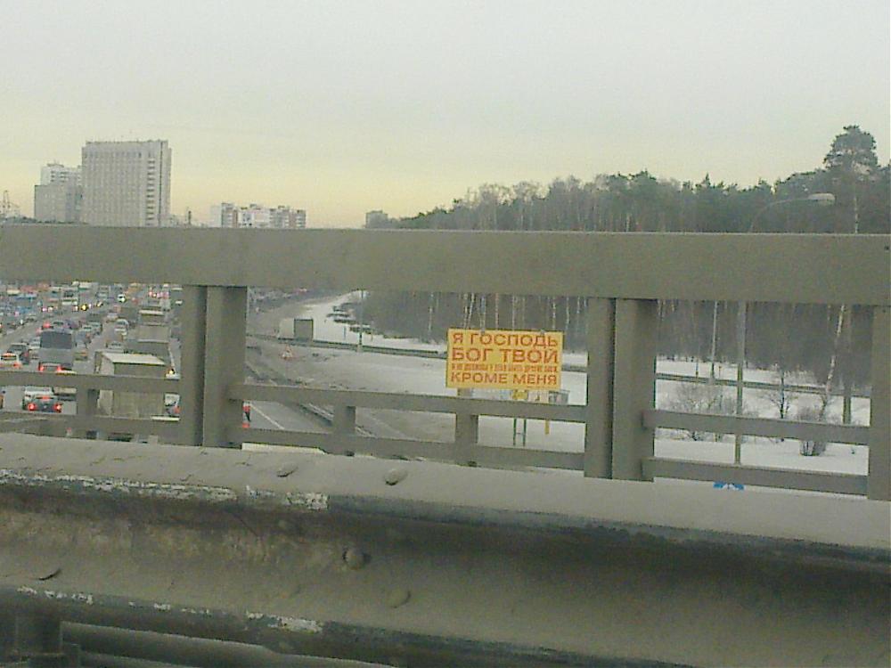 Недавно увидела вот такой плакат и решила поделиться с вами. КАК думаете что это обозначает, кто за ним стоит и какие цели они преследуют. Это съезд из города на МКАД (развязка). Район Люберцы.