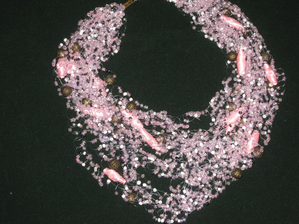На шее смотрятся нежно,а когда совсем мало нитей бисер теряется, украшение кажется незаконченным, носит эффект дешевизны, кроме того в изделии есть металлические бусины и бусины из атласной ленты (тоже самодельные), и вот именно они смотрятся "одиноко" без бисерной массы.