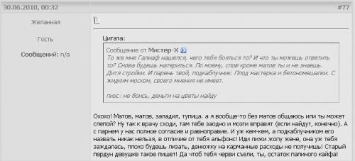 Но в свой адрес оскорблений я не терплю, поэтому иди качайся в свой спортзал, ПО ГЛУПОЙ НАДЕЖДЕ, ЧТО ЭТО ТЕБЕ ПОМОЖЕТ! |