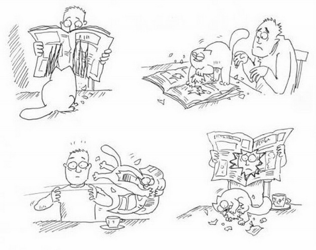 У меня есть кошка, которая дожила до половой зрелости и ей был доставлен кот. А кот, хоть и очень озабоченный сексуально, но ещё девственник и, что делать со столь же девственной подругой, не знает. То поперёк на неё влезет и дёргается, то на голову ей влезть норовит (наверное, француз...). Результатами своих попыток он настолько недоволен, что их количество стало минимальным. Вот я занимаюсь уборкой помещения, а эта парочка, наконец, достигла некоторого консенсуса и слилась в экстазе. Я несу охапку одежды и из этой охапки по полу тянется поясок. Увидев это, кот вдруг прекращает своё почётное занятие и бежит играть с пояском. Кошка была ТАК удивлена побегом кавалера, что я впервые в жизни наблюдал действительно обалдевший взгляд у животного. Тоже, небось, подумала, какие же мужики сволочи...