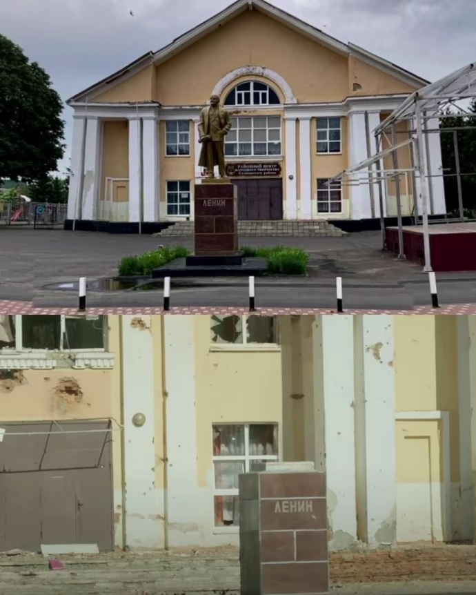 В освобождённой от путинского фашистского режима Судже на территории молодой Курской Народной Республики в рамках процесса декоммунизации был снесён памятник массовому убивцы Ленину.