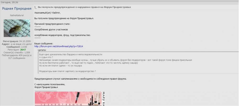 За нецензурные выражения, оскорбления, флуд, троллинг в темах: Секты в ПМР, от Днестровска - тираспольчанам: предупреждение !!! Ваша любимая выпивка Ищем спонсора! Секты в ПМР кофе или чай ? Создать рок группу в Тирасполе Желанная Мои выборы... Украину насилуют Где можно провести досуг в Бендерах И это ещё не всё. Поэтому, считаю своим долгом изолировать его из нашего форумного общества. |