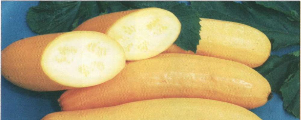 Хелена Сорт ранний, от всходов до первого сбора зеленца - 41-45 дней. Растение кустовое, ажурное. Плод цилиндрический, длиной 20-22 см, массой 0,4-0,6 кг. поверхность гладкая, золотисто- желтая. Мякоть желтая. Урожайность 15-27 т/га. Мучнистой росой и бактериозом поражается в средней степени. Предназначен для консервирования и домашней кулинарии. |