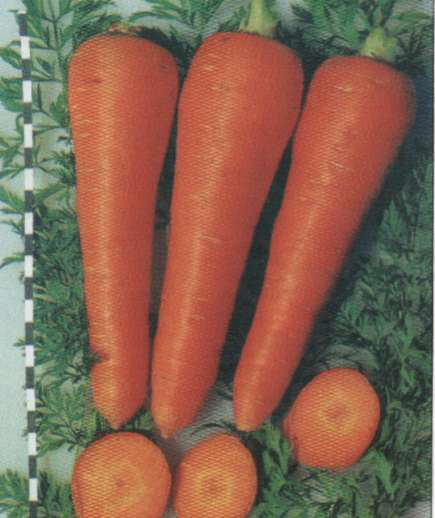Колорит Гибрид ранний с дружным формированием урожая пучковой продукции и быстрым накоплением р-каротина. Отличается выравненностью корнеплодов и имеет высокий выход товарной продукции. Корнеплоды утолщенно-цилиндрической формы, оранжего-красного цвета, длиной 16- 18 см, хороших вкусовых качеств. Отлично хранится зимой. Относительно устойчив к болезням. Пригоден для изготовления детского и диетического питания, так как имеет низкое содержание нитратов -20-60 мг/кг. |