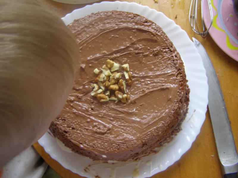 И ещё одна ошибка --Лена когда ты решила сделать ореховую посыпку то ложить такие крупные долькти грецкого ореха не эстетично и не функционально . В следующий раз возьми ядра и натри их на тёрочку , причём не через блендер а именно натри . И натри поболее чтоб вся верхняя плоскость торта была покрыта просыпкой аналогично как посыпают кокосовой стружкой . Получится красивее и приятнее на вкус .