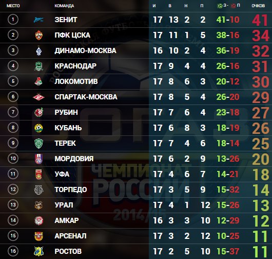 Любителям футбола, кто следит за РПЛ, предлагаю обсудить промежуточные результаты чемпионата России 2014-2015. Кто и что порадовало, разочаровало, удивило? Прогнозы и ожидания от весенней части чемпионата.