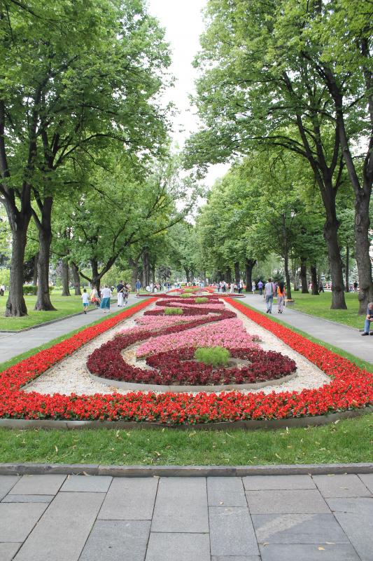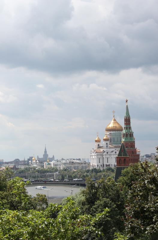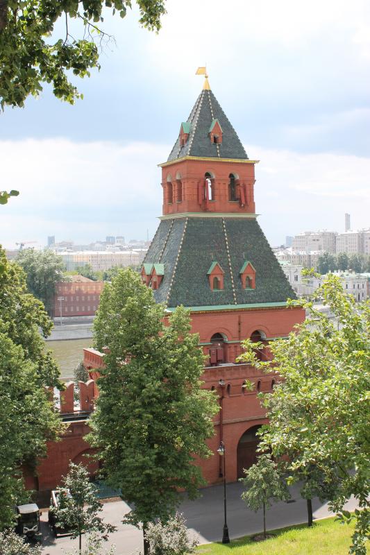 Колокольня Иван Великий Успенский собор Купола собора в Кремле Кутафья башня Башня Кремля - вид из парка внутри Кремля. Большой Кремлёвский сквер - здесь можно спрятаться от жары, отдохнуть и перекусить. Цветы на поляне в Кремле Фонтан в Кремле Вид на центр Москвы с Кремлёвского сквера |
