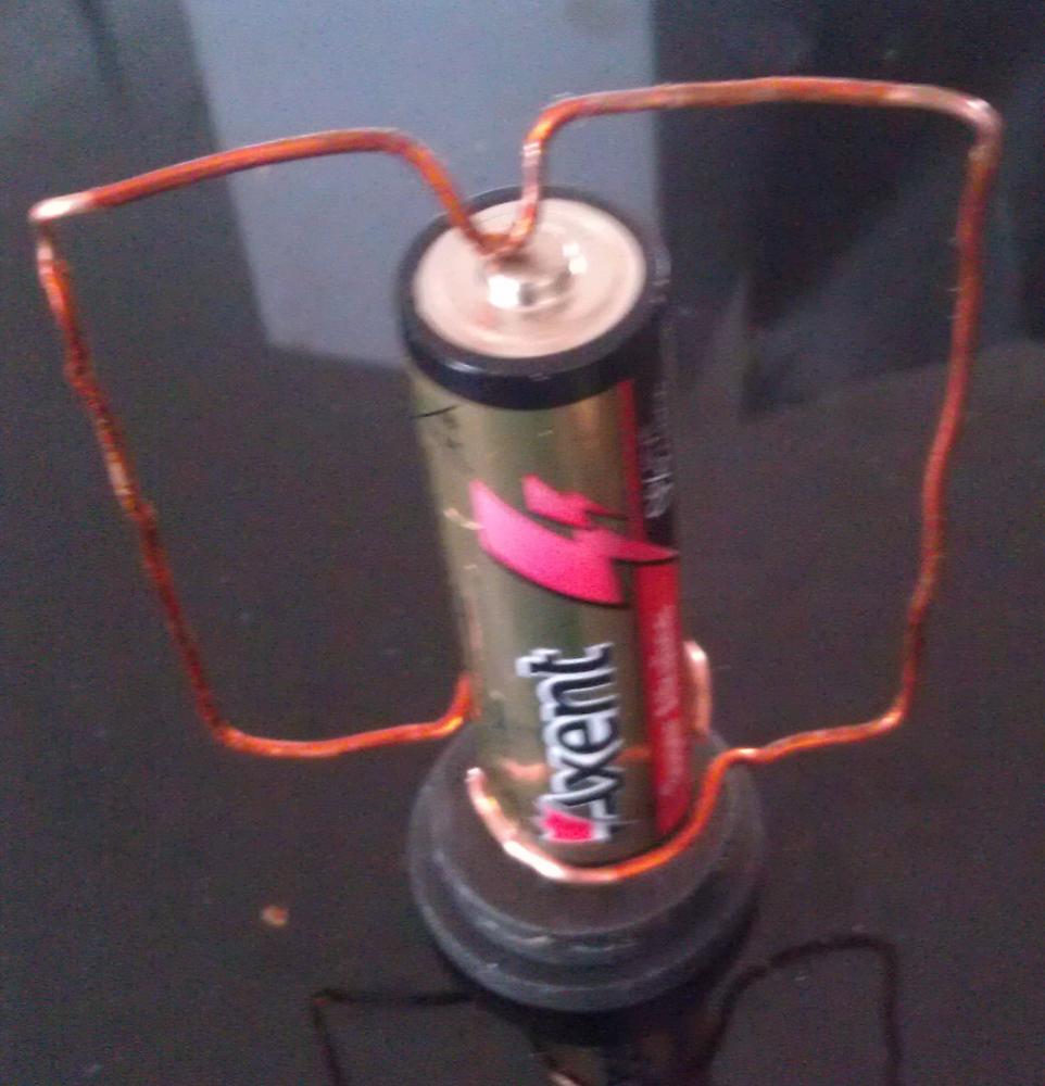 В этом опыте рамка должна вращаться вокруг батарейки, под которой прикреплен магнит.
