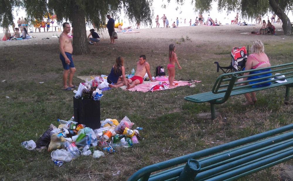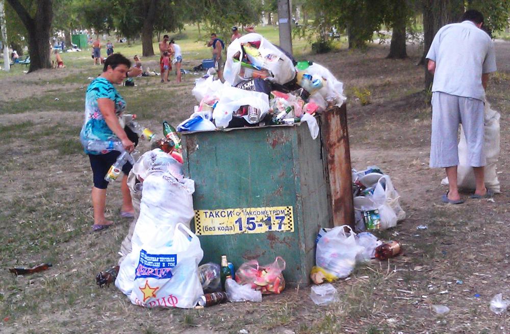 Полные контейнера с мусором - уже скоро вечер воскресенья. Люди отдыхают рядом с мусором, дети... |