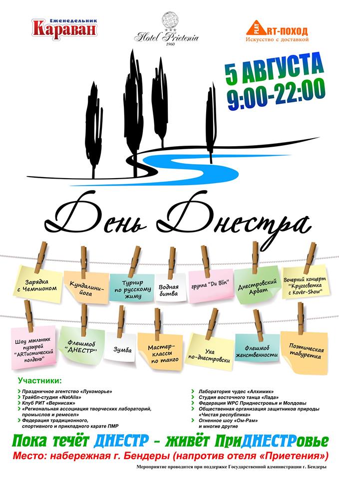 Бодрое и позитивное начало Дня Днестра, отличное самочувствие и настроение обеспечит всем желающим утреннее занятие йогой и медитацией прямо на берегу Днестра. Занятие за благотворительные пожертвования проведет инструктор по кундалини-йоге и просто душевная девушка Инна Козловская. Спортивную форму брать необязательно, все, что требуется – это ваше желание быть счастливым в День Днестра! 10:00-12:00 – Акция «Меняем искусство на рубли» Думаете, что Художнику сложно заработать в наше время? А вот и неправда! Все утро маленькие художники и фотографы могут обменять свои рисунки и семейные фото с изображением летних забав, пейзажей и портретов на скидочные купоны от ресторана «Приетения». Накормите художников мороженым, лимонадом и прочими вкусняшками со скидкой – День Днестра позаботился о том, чтобы ваш семейный бюджет не пострадал! А все собранные рисунки и фото украсят большую выставку «Лето, каникулы, река». 10:00 – «Зарядка с Чемпионом» Чемпион Молдовы по силовому экстриму Игорь Емельянов, тренер фитнес-центра «Color Fit» проведет зарядку для всей семьи прямо на набережной Днестра! 10:15 – Показательное выступление от настоящих карате-мальчишек из Республиканской федерации традиционного, спортивного и прикладного каратэ (г. Тирасполь) 10:30 – «Водная битва» Развлекательная программа для детей от праздничного агентства «Лукоморье». Зажигательные герои любимых мультиков, веселый девчоночий визг и азартные мальчуковые вопли, мокрые футболки и водяную битву гарантируем! Не забудьте захватить самое мирное и приятное «оружие» из всех существующих - водяные пистолеты или обычные пластиковые бутылки с водой! Боеприпасы обеспечим☺ 11:30 – «ARTистический полдень» Кому в жаркий полдень хоть раз помешал стакан лимонада или мороженое? Во время ланча в уютной дружеской атмосфере вас ждут: «Река в картинах» - интерактивная «познавательная страничка» от Кати Карениной «Поэтическая табуретка» - читаем любимые стихи (свои и чужие) в хорошей компании. Фото на табуретке – гарантируем☺ Мастер-класс для детей по изготовлению игрушек в технике оригами от талантливой приднестровской кукольницы Нади Войтенко. Увлекательная викторина и рассказ о Днестре от юных экологов из организации «Чистая Республика». 14:00 – Уха по-днестровски Обед у нас – по расписанию. Ароматная, вкуснейшая уха от ресторана «Приетения» – такой вкуснятины вы еще не пробовали! 15:00 – флешмоб «Днестр» на набережной г. Бендеры. Чем мы хуже Книги рекордов Гиннеса? Создадим вместе самое яркое и большое слово «Днестр» в истории человечества – пусть этот рекорд станет первым в Книге рекордов Приднестровья! 16:00 – «Йожики-2» Кундалини-настройка на отличный вечер, йога и медитация для всех возрастов с Инной Козловской! 16:00 – Детская программа от лаборатории «Алхимик»: игры с мыльными пузырями и занимательные научные опыты. 16:30 – Зажигательная зумба от Дины Фомичевой. Растрясем послеобеденные булочки под отличные зумба-треки. Все комплексы и сомнения в себе оставьте дома – любите себя, танцуйте от всего сердца! 17:00 – Жми давай! Товарищеский турнир по русскому жиму и показательное выступление с элементами силового экстрима от Федерации пауэрлифтинга Приднестровья и Молдовы. Это длинное предложение означает только одно – мускулистых красавцев, которые расскажут и покажут о здорово