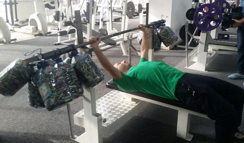 Жим лежа с батарейками. 130 кг. Тренажерный зал Адреналин. За месяц собрано в ПМР - 150 кг. батареек.