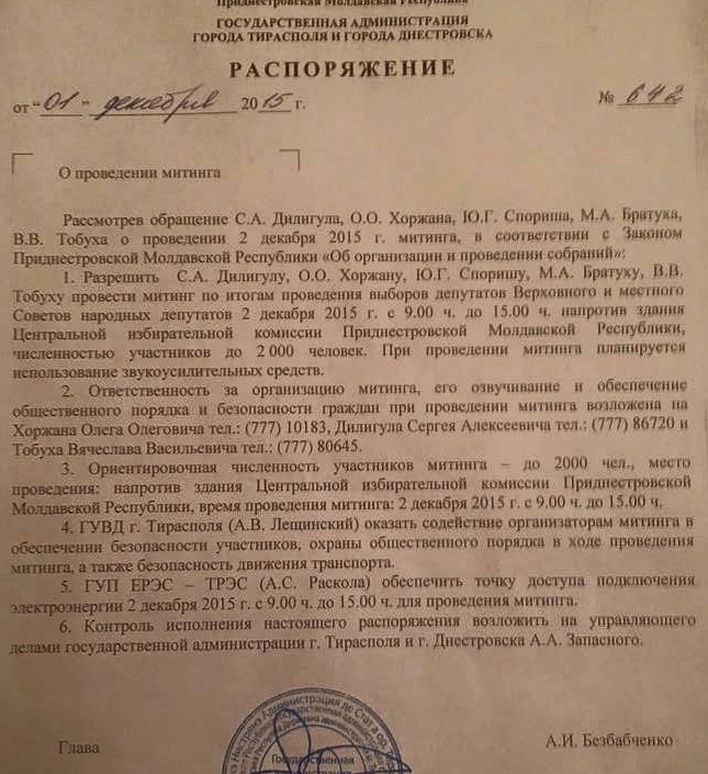 Грязные технологии продолжаются и после выборов. - в клубе "Ветеран", месте, где встречаются самые заслуженные люди республики совершавшие без преувеличения ратные и трудовые подвиги, сегодня произошла сходка далеко не самых "честных" кандидатов, многие которые совершали совсем иные "подвиги", а порой и предательство (т.е. само действо изначально кощунственно). Судя по тому, что в сходке участвовали кандидаты "Шевчука", а также замечен, как минимум, один официальный представитель Президента - это мероприятие инициировано "сверху"; - они решили собрать людей на "митинг" против результатов выборов. Это не что иное, как попытка узурпации власти. Прокурор республики уже выступил с заявлением о том, что митинга никто не санкционировал (prokuror-pmr.org); - собирают они людей, путем обзвона своих сотрудников (проиграли кандидаты, являющиеся руководителями Калиюги, Циты, Ипотечного и более мелких предприятий) и заставляя их под страхом увольнения выходить на завтрашнее "мероприятие". Это грязные игры грязной власти. Не ведитесь на них. - Что творится?!девочка- студентка написала, что Студенты от Бобковой освобождаются официально от занятий для участия в этом митинге. Студентам объяснила, что они не должны дать ЦИКу подписать результаты выборов. Еще студенты притащат палатки!!! Ректоры, про ректоры, деканы и просто люди!!!! Одумайтесь!!! Не берите грех на душу! Вас же родители проклянут!!!! - Металлурги! Не позволяйте превратить вас в такое же средство производства, как оборудование в ваших цехах. Вы - работники предприятия, а не заказные митингующие. Оставайтесь на своих рабочих местах. Все, как один! Требуйте письменного приказа или распоряжения. У противозаконных методов есть автор, и пусть он берет на себя ответственность за последствия. Они могут быть разными, и даже очень плохими для вас. Думайте о своих семьях. Президенту ПМР Е.В. Шевчуку Гражданин Приднестровья Петрик Ю.А. Господин Президент! Состоялись Выборы и результаты их известны! Ни для кого уже в Приднестровье не секрет, что эти результаты Вас не устраивают. Группа кандидатов, которые известны как Ваши сторонники потерпели сокрушительное поражение. Но некоторые из них никак не могут успокоиться, и призывают людей на некие митинги и протесты. В наших условиях это очень опасно! И потому, как ПРОИГРАВШИЙ кандидат я призываю Вас проявить мудрость и не допускать обострения ситуации. Все нарушения закона должны рассматриваться в суде! И только суд вправе решать надо или нет отменять результаты Выборов. По другому пути идти нельзя, ибо это путь гражданского противостояния. Ваши кандидаты в большинстве потерпели поражение. И даже там, где они прошли за счёт неимоверного напряжения админресурса, даже там народ выразил своё мнение и дал оценку политике, которую Вы проводите. Даже там где ваши кандидаты победили, кандидаты от народа не проиграли! Найдите в себе мужество признать этот факт! Люди хотят жить достойно и свободно! Они имеют на это право. И всем нам надо думать не о том, как навредить, а том, как улучшить положение наших граждан. Давайте будем созидать, а не разрушать! Призываю Вас обратиться к своим сторонникам, готовящим несанкционированный митинг, прекратить эти деяния. Призываю Вас признать результаты Выборов в Верховный Совет. Призываю Вас идти по пути мира и согласия! 1 декабря 2015 Петрик 