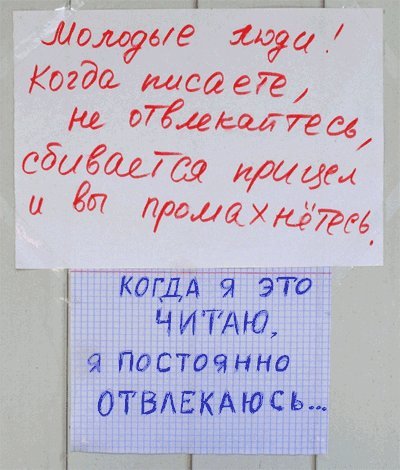 2. В связи с ремонтом парикмахерской укладка женщин будет производиться в мужском зале.. 3. В семь вечера в среду в третьем подъезде состоится собрание. Повестка дня: выборы домового. 4. В виду холода в рентгеновском кабинете делаем только срочные переломы. 5. Вы получите био-туалет по любому адресу в Москве в течение одного дня. А вместе с ним инструкцию на русском языке и квалифицированную демонстрацию. 6. Вяжем детские кофточки из шерсти родителей. 7. Девушка по имени Лена, которую я встретил 12 октября неподалеку от станции "Кузьминки"... Твои белокурые волосы и красное пальто - все, что у меня осталось. Прошу откликнуться. Игорь. 8. Делаем полиэтиленовые мешки по размеру заказчика. 9. Дети выдаются отцам только в трезвом состоянии. 10. Дети до пятилетнего возраста проходят в цирк на руках. 11. ЗУБЫ? Наши стоматологи сделают все, чтобы вы навсегда забыли о них! 12. Кондитерская фабрика приглашает на работу двух мужчин - одного для обертки, другого для начинки. 13. Ларек "Вторсырья" принимает отбросы общества охотников и рыболовов в виде костей. 14. Лифт вниз не поднимает. 15. Один звонок, и вам оформят свидетельство о смерти, изготовят венки! 16. Приглашаются грузчики для интересной работы. 17. Продается коккер-спаниель. Мать признана "Лучшей сукой породы". 18. Продается немецкая овчарка. Недорого. Ест любое мясо. Особенно любит маленьких детей. 19. Продается русский голубой кот. Без документов. 20. Продаю коляску для новорожденного синего цвета. 21. Продаются три поросенка, все разного пола. 22. Продаются четыре гусыни и гусак. Все несутся. 23. Ресторан не работает, официантки все распущенные. 24. Сегодня в холле гостиницы состоится лекция на аморальные темы. Читает милиция. Вот нарыл на соседнем форуме! P.S.На авторство не претендую-копипаст |