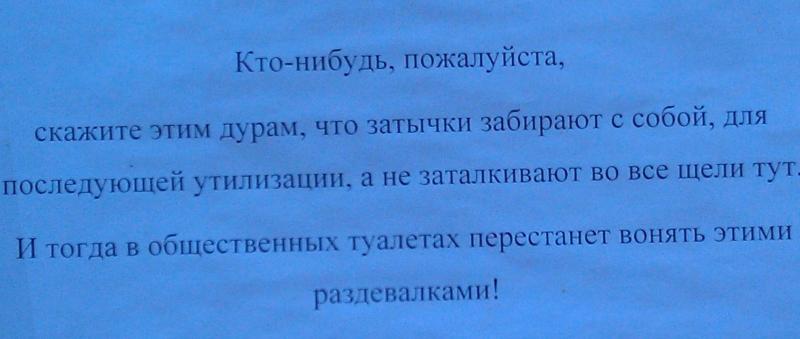 Слабенькое объявление, надо прямо сказать: Не гадьте иначе поймаю,вырву гланды .