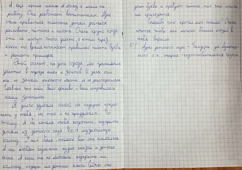 Бендеры, Лилия 11 лет. Просит морскую свинку. Братику 4 года - машинку. Живут небогато.
