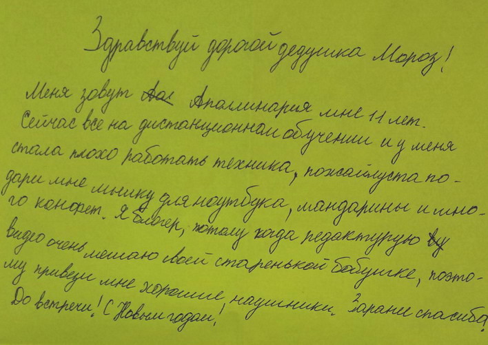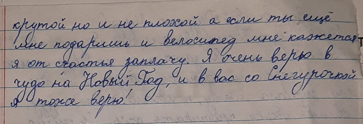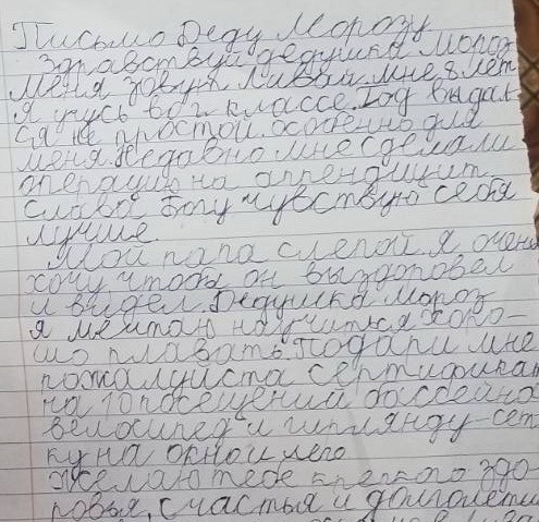 1.Амиль 7 лет, просит пижаму с рисунками и капюшоном 2.Ливай - сертификат на 10 посещений бассейна, лего, велосипед, гирлянду на окно. Папа не видит. 3. Милан 9 лет Здравствуй волшебный Дед Мороз. Это письмо я пишу для тебя. Я очень хочу чтобы всё что я написал для тебя сбылось. Я хочу чтобы Ливай поскорее поправился и играл как раньше. Я хочу чтоб Папа стал видеть, а мама стала доброй. Так же я хочу для Гокки ошейник желтого цвета и красный поводок. Гокки -это моя собака породы Хаски. Ему 2 месяца, он смешной игривый и ласковый пес. Я думаю что в Новый год ты исполнишь желания всех. Я хочу отучиться на программиста и помочь папе, чтоб к нему вернулось зрение. С любовь Милан. А ещё дай Леваю новые ( не понимаю это слово)), а Амилю собственный телефон. Они хорошо вели себя в этом году и запрашивают всё это. Это мои братья. Вложение 27923Вложение 27924