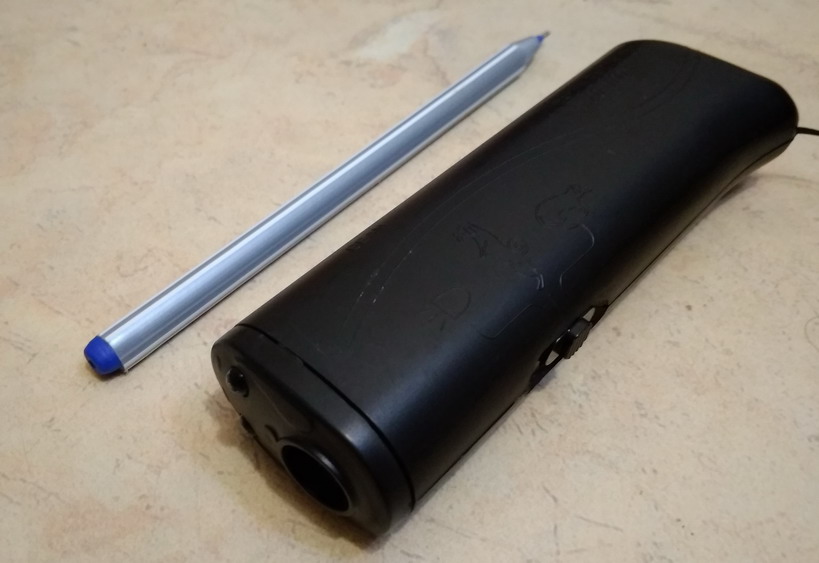 Отпугиватель собак издает какой-то инфразвук, его слышно хорошо в 10 см от уха, а так же фонарик мигает - может он пугает собак ))