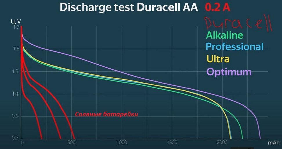 Интересный график, показывает что батарейки Дюрассел в 4-10 раз более емкие, чем дешевые соляные батарейки. Взято с ютуб обзора блогера какого-то.